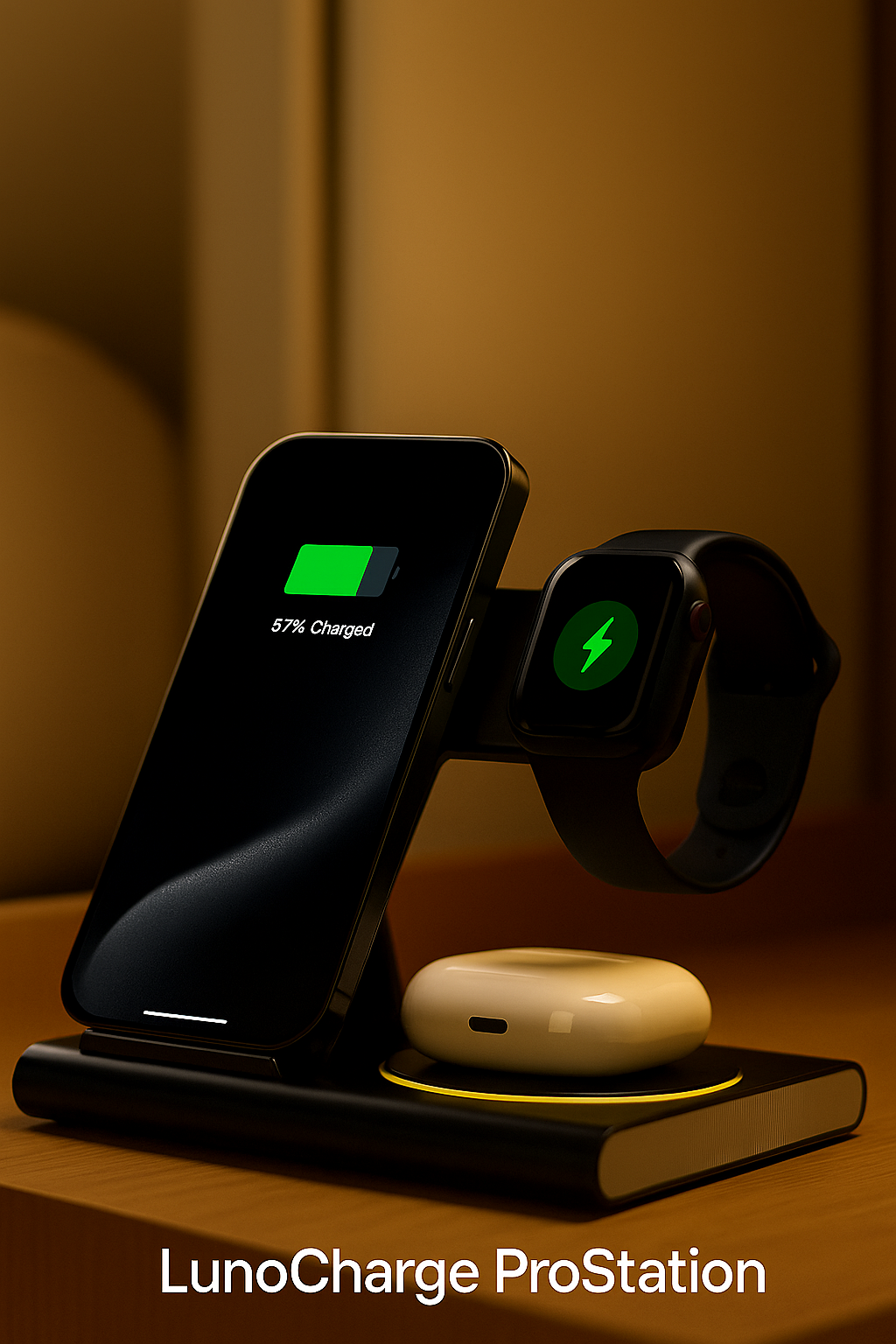 LunoCharge ProStation is a beautifully engineered, ultra-versatile 4-in-1 wireless charging hub designed for the Apple ecosystem, delivering elegant style and advanced functionality for the modern workspace.